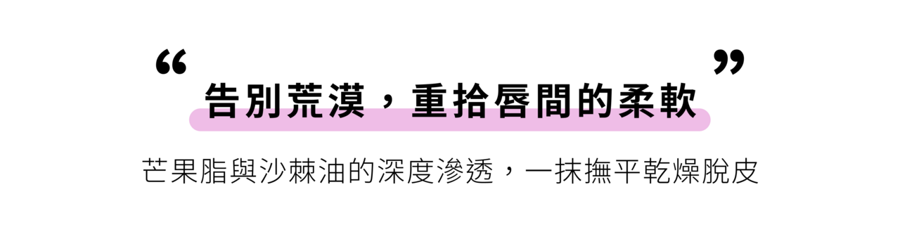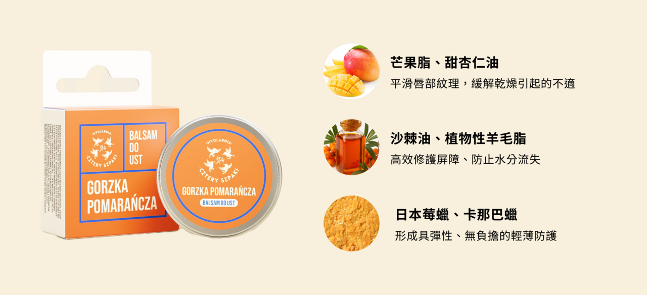 配方選用真正有效的成分:芒果脂、沙棘油、純素羊毛脂和日本藍莓蠟。芒果脂軟化並舒緩雙唇,沙棘油修復並緩解不適,羊毛脂保護雙唇,而藍莓蠟則為整個產品包裹一層輕盈的保護膜。它不粘膩、不厚重,護唇膏塗抹在雙唇上即可快速被吸收,持久滋潤,無需頻繁補塗。