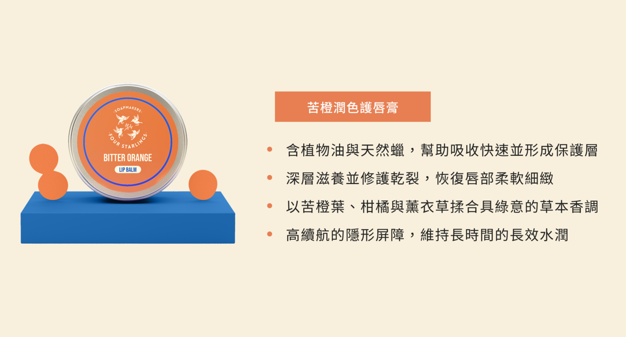 苦橙潤色護唇膏是我們打造柔軟、光滑、滋潤雙唇的理想選擇。這款潤唇膏質地輕盈,可以同時滋養、舒緩雙唇並防止乾燥,且不會留下油膩感或厚重感。