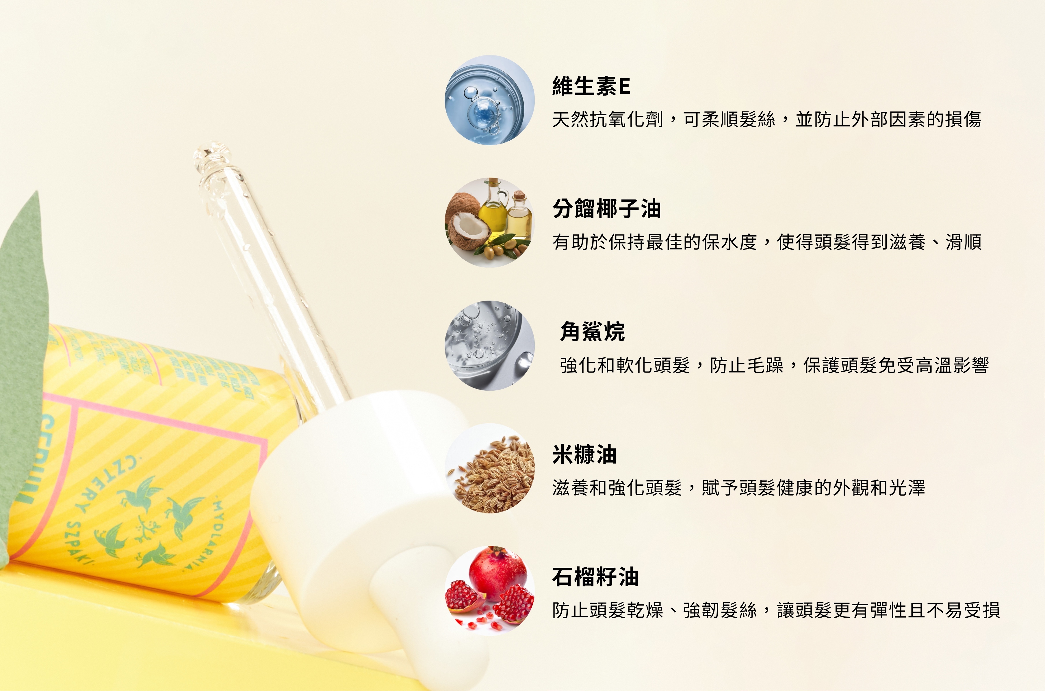 · 多種滋養油組合防止髮尾乾燥,增加頭髮保水度